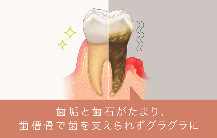 つまり、気づかぬうちに症状が悪化し、歯医者へ受診した時には重度まで進行している可能性が高い恐ろしい感染症ということです。通常、歯周ポケット(歯と歯茎の間の溝)は、細菌の侵入を防ぐためキュッと引き締まっている状態です。ただ、ケアが不十分だとこの歯周ポケットに細菌の塊である歯垢や歯石が溜まり、歯周病の原因となります。その状態が定着してしまうと、歯周病の第一段階である「歯肉炎(歯茎が赤く腫れる炎症)」が症状として表面化します。また、歯肉炎の症状が進行すると、歯茎/歯周組織を破壊する「歯周炎」となり、最終的に歯を失うことに…。